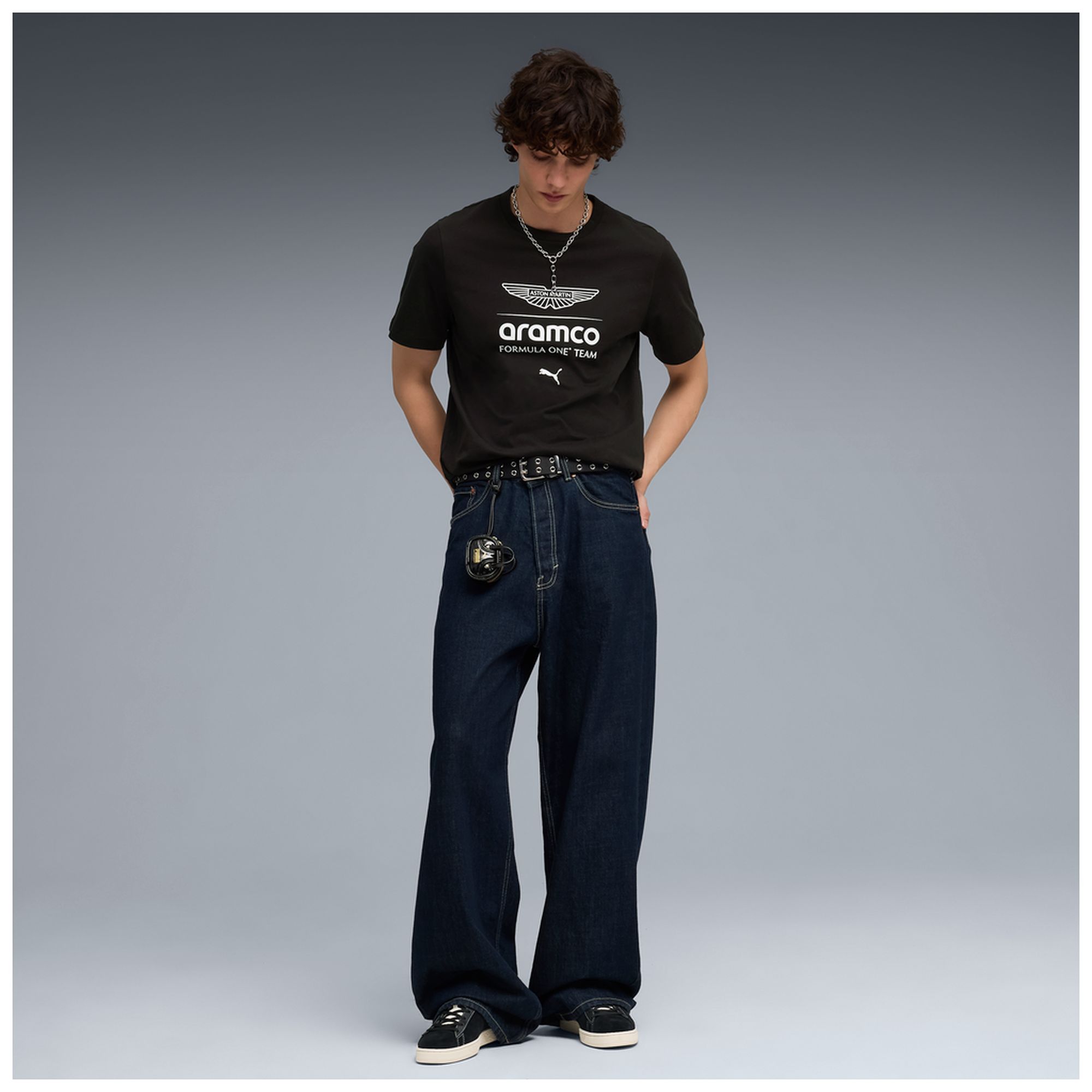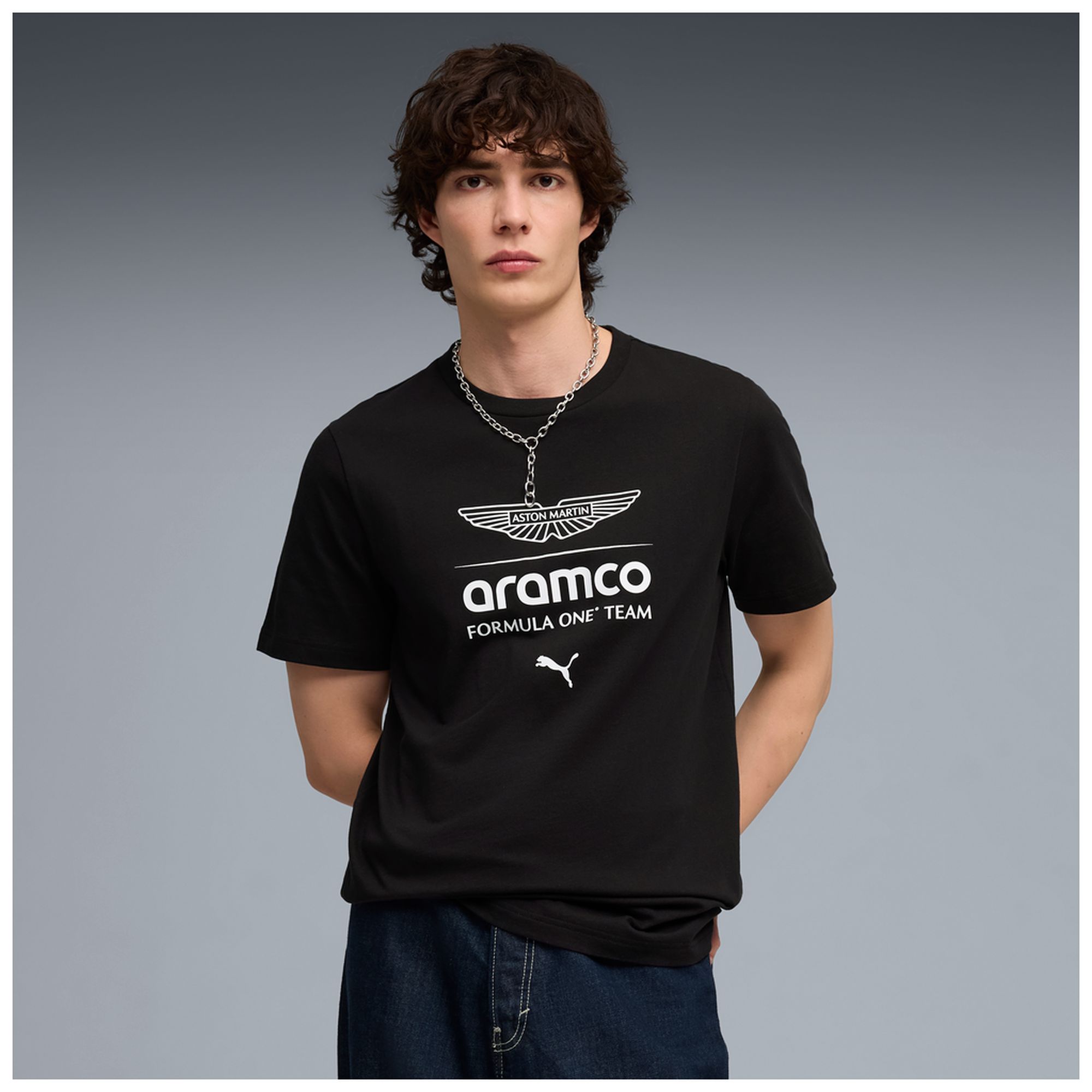 - Schwarzes T-Shirt mit Aston Martin Wings-Logo und „Formula One Team"-Schriftzug auf der Brust, Puma Logo und Aramco-Branding auf den Ärmeln