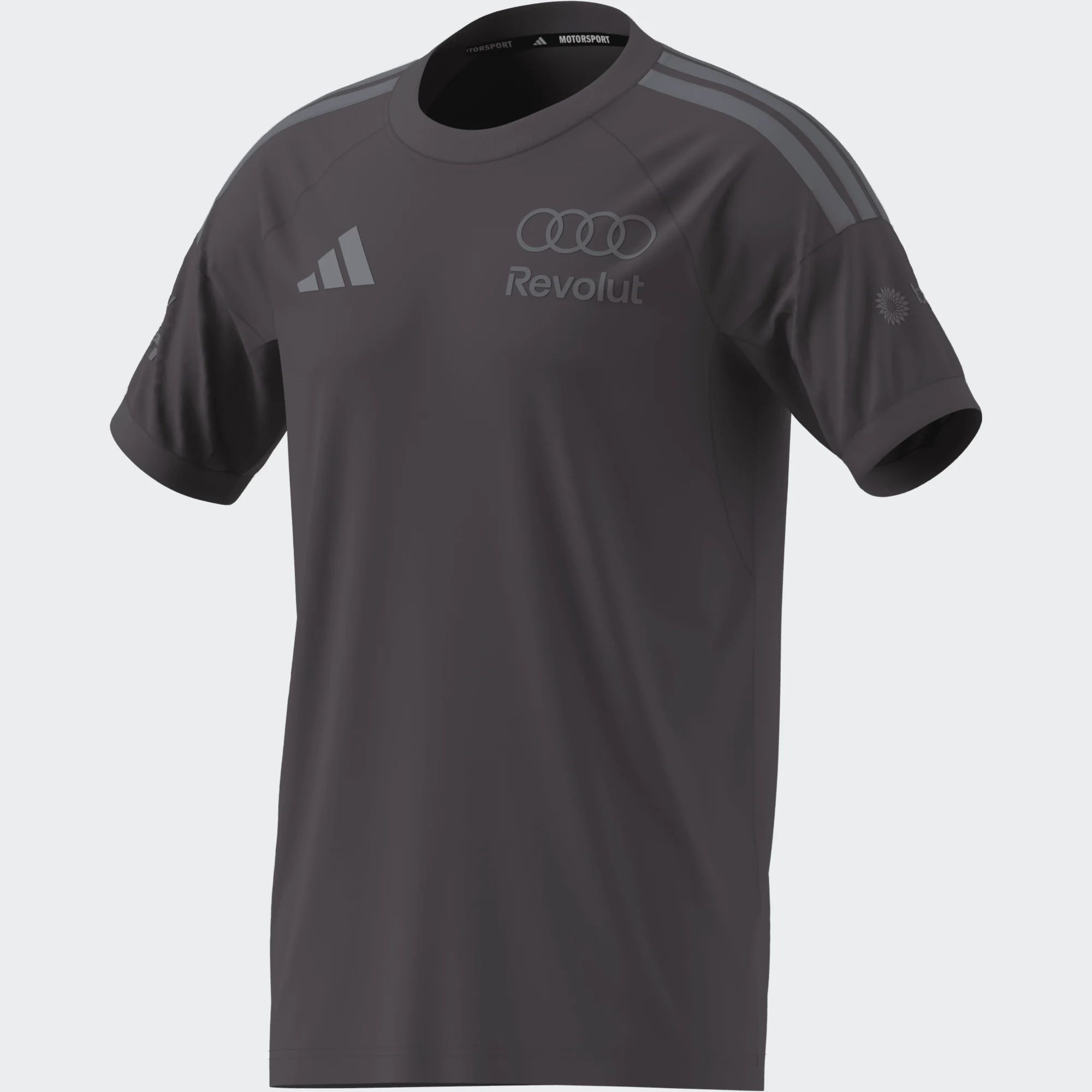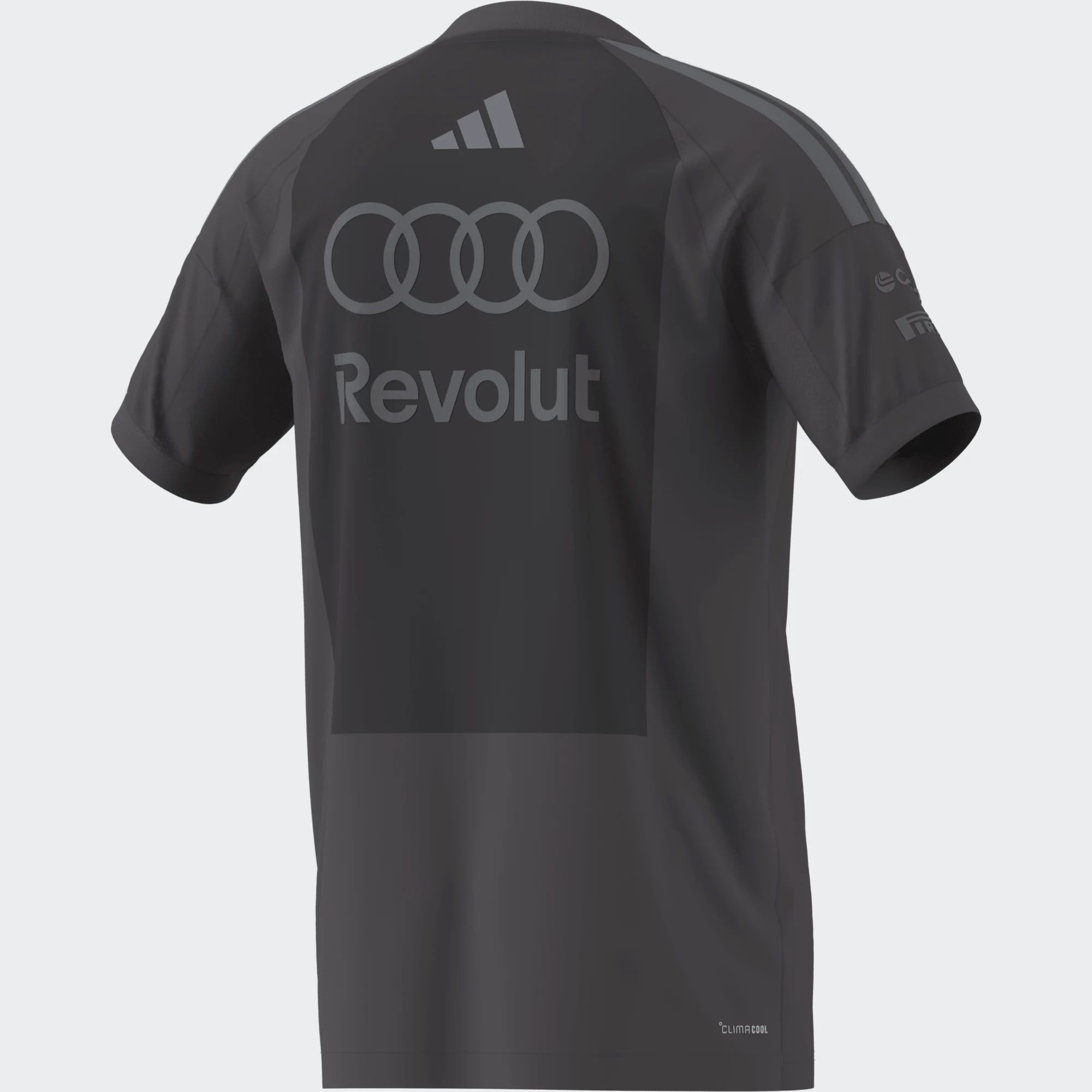 Das graue T-Shirt im Team-Design trägt auf der Brust das Audi-Logo mit "Revolut"-Schriftzug sowie das Adidas-Logo – genau wie die Fahrer im Paddock. Die Adidas-Streifen verlaufen markant über die Schultern, der Schriftzug "Motorsport" ziert den Innenkragen. Auf der Rückseite sorgt ein großflächiger Audi-Logo-Print mit "Revolut"-Schriftzug für einen starken Statement-Look. Die Logos der Teamsponsoren auf den Ärmeln und das Climacool-Branding am Saum runden das authentische Team-Design ab. Der sportliche Schnitt mit Rundhalsausschnitt bietet dabei optimale Bewegungsfreiheit – ob auf der Tribüne, im Gym oder im Alltag.
