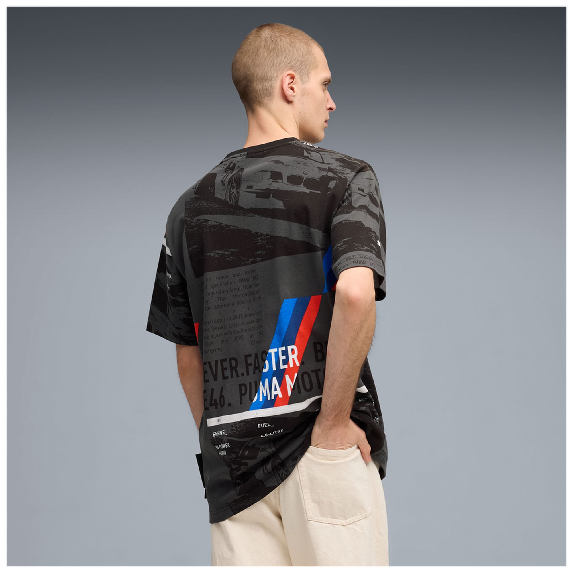 - Dynamisches Allover-Design mit M-Streifen, Typografie und Motorsport-Grafiken auf Vorder- und Rückseite