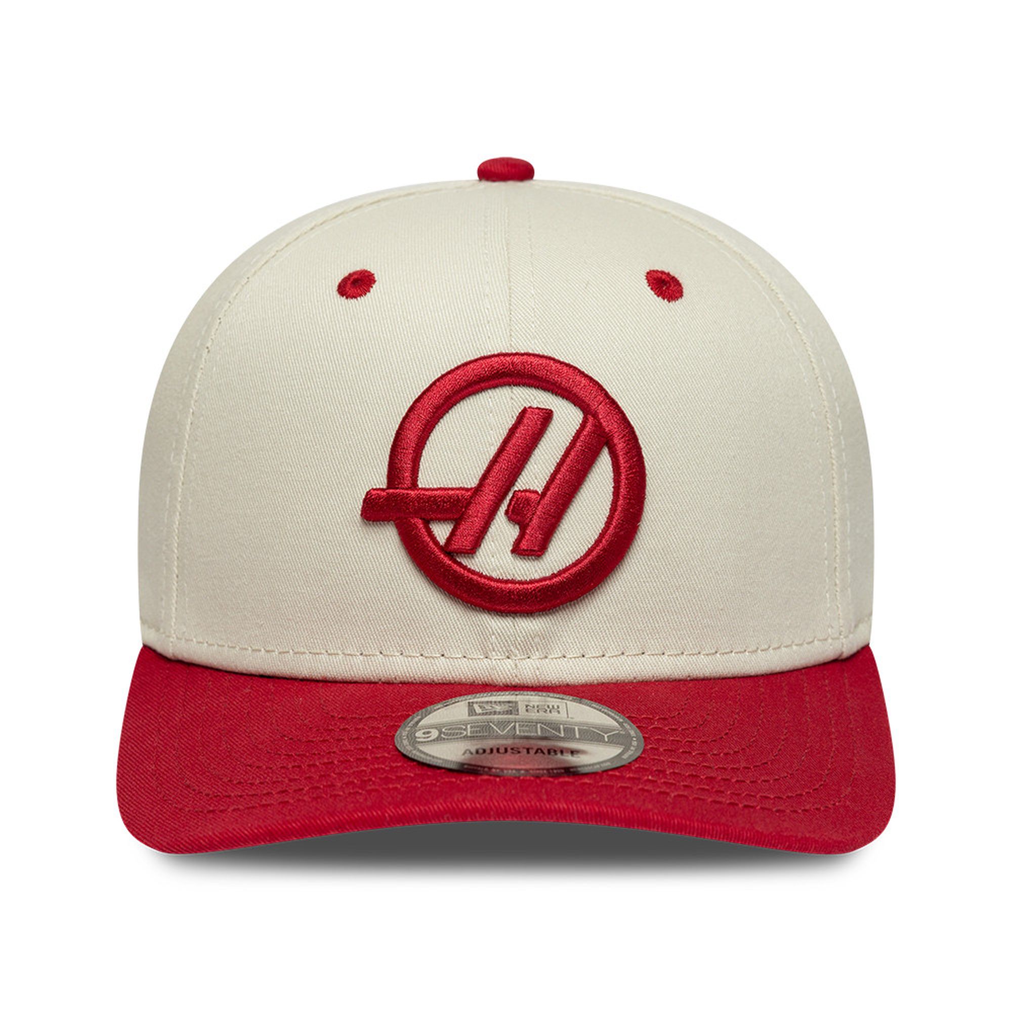 Die Cap überzeugt mit einem markanten Two-Tone-Design: Die hellbeige Krone wird durch das große, aufgestickte Haas Teamlogo in Rot auf der Vorderseite dominiert und setzt ein unverkennbares Markenstatement. Das rote Schild bildet einen starken Kontrast und wird durch die farblich abgestimmten Ösen und den roten Top-Button harmonisch ergänzt. Das New Era Logo ist dezent auf der linken Seite der Krone platziert. Der Snapback-Verschluss in Rot auf der Rückseite ermöglicht eine individuelle Größenanpassung und sorgt für einen sicheren, bequemen Sitz – perfekt für das Rennwochenende, den Besuch an der Rennstrecke oder den sportlichen Alltag.