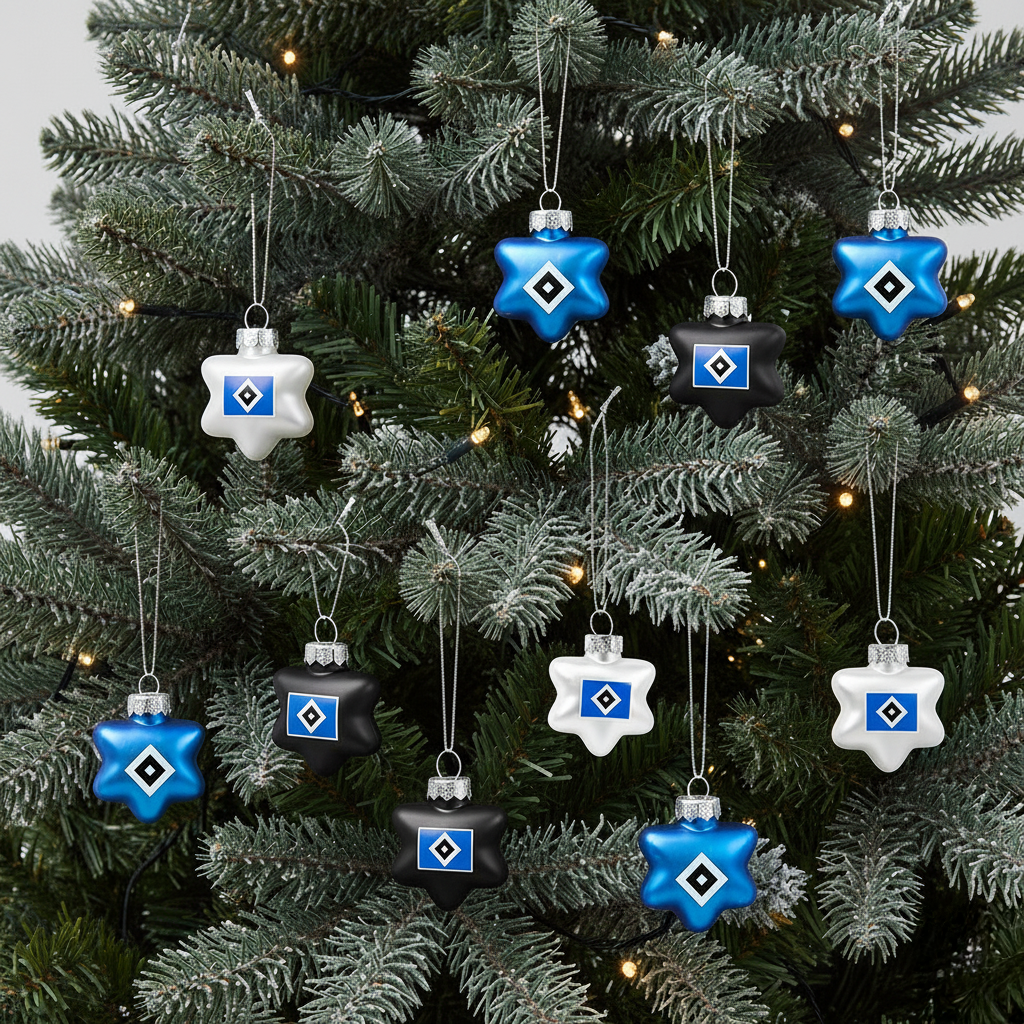 Festlicher geht’s kaum: Mit dem HSV Christbaumsterne 10er Set in Vereinsfarben bringst du nicht nur weihnachtliche Stimmung, sondern auch echten Fan-Spirit an den Tannenbaum. Ob in Blau, Weiß oder Schwarz – jede der zehn kleinen Glassterne ist mit der HSV-Raute verziert und sorgt für stimmungsvolle Deko in deinem Wohnzimmer. Ideal als Geschenk für echte HSV-Fans oder als besonderes Highlight am Baum!