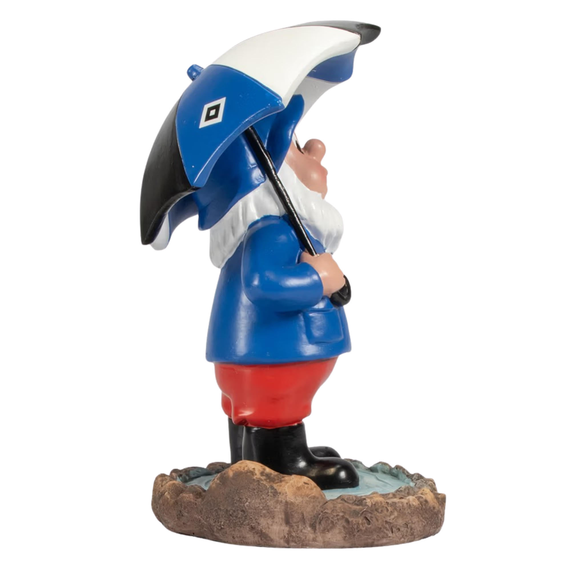 Stehend in einer kleinen Pfütze verkörpert er den Geist aller echten HSV-Fans: Unerschrocken, humorvoll und stolz. Der blaue Mantel mit weißer Raute und die roten Hosen prägen das charakteristische Vereinskleid, während der Regenschirm – ebenfalls mit HSV-Raute – perfekt zum Outfit passt. Gefertigt aus hochwertigem Polyresin ist dieser Zwerg absolut wetterfest und begleitet dich zuverlässig durch alle Jahreszeiten im Garten oder auf dem Balkon.
