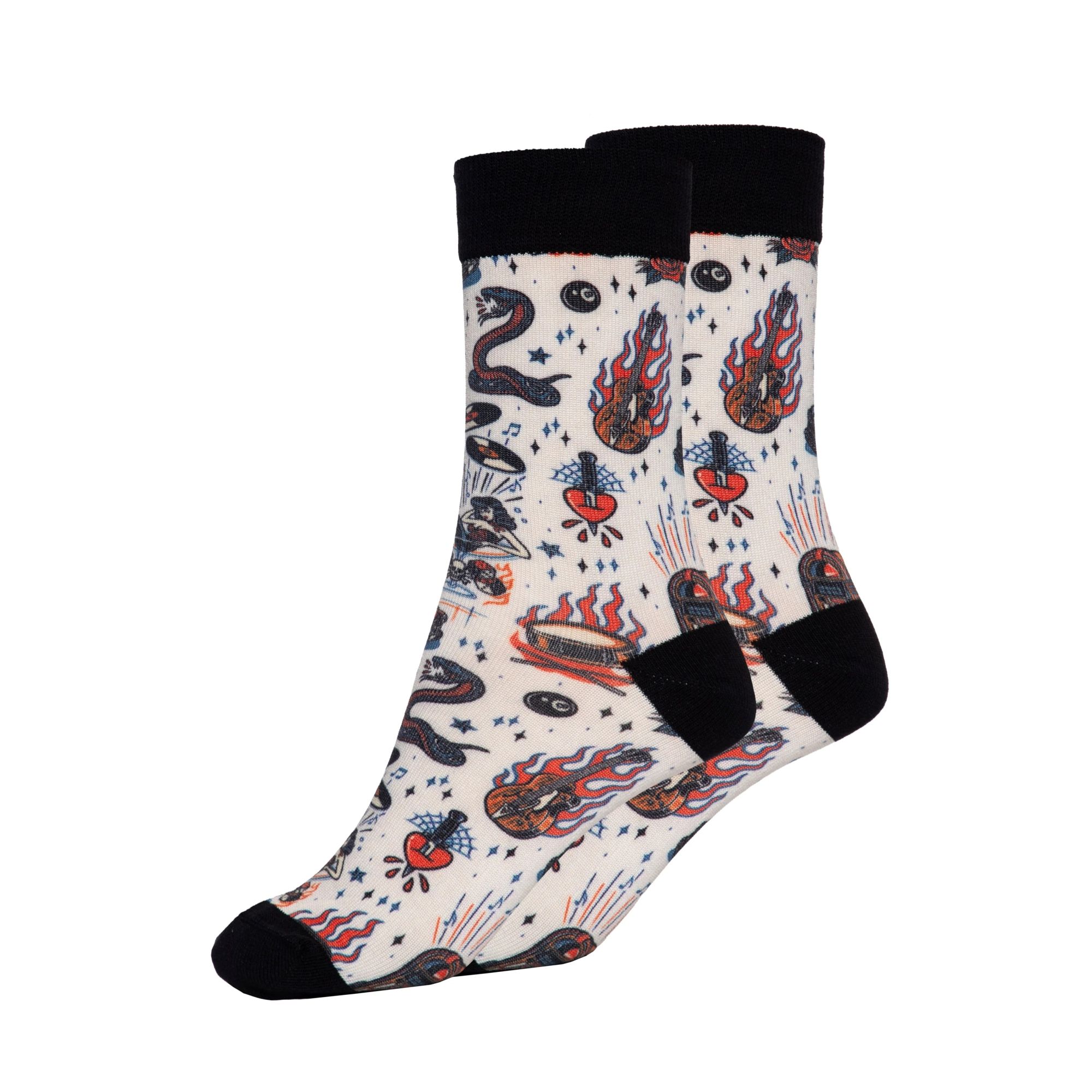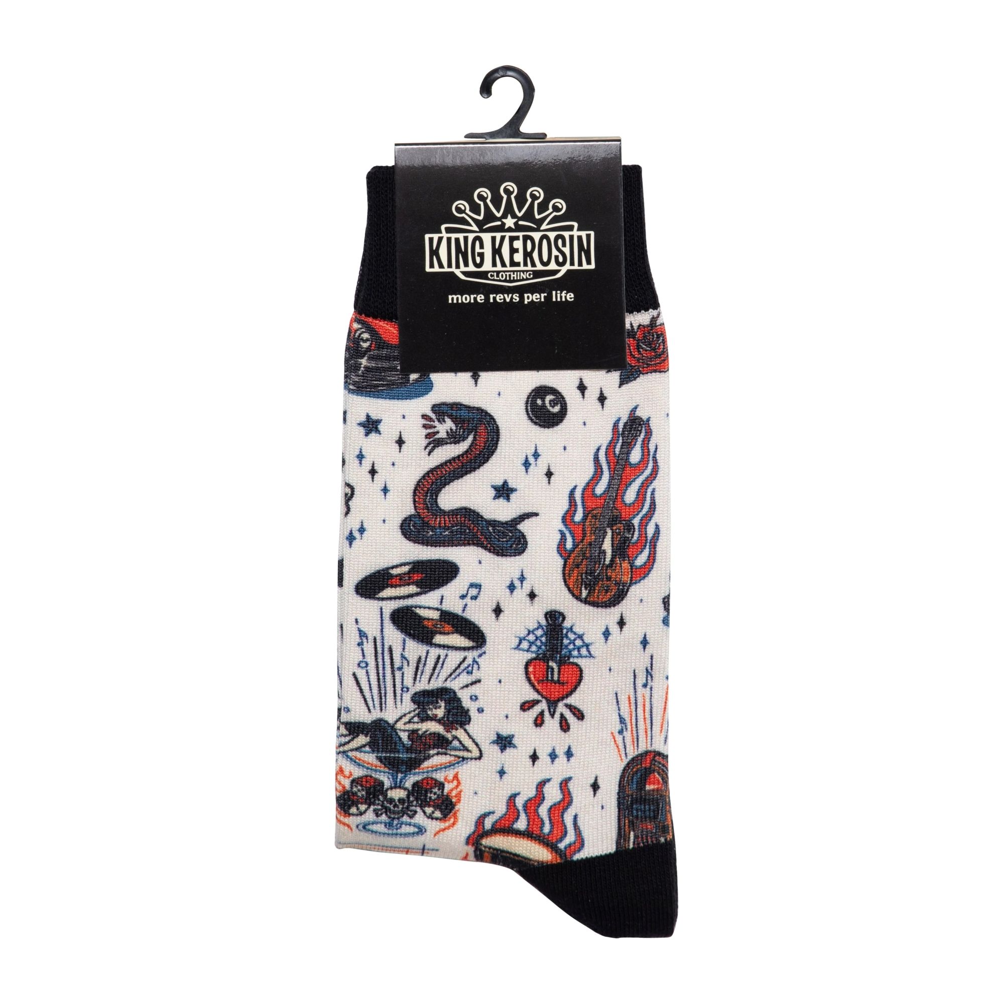 Das detailreiche Allover-Design im klassischen Tattoo-Stil vereint alles, was die Szene ausmacht: Schlangen, brennende Gitarren, Hot Rods, Pin-Ups, 8-Balls, Schallplatten und Herz-Motive in kräftigen Farben auf weißem Grund. Der schwarze Bund, die schwarze Ferse und Spitze setzen einen sauberen Kontrast und sorgen für einen cleanen Abschluss. Das elastische Material sitzt bequem, ohne einzuengen, und macht die Socken zum idealen Begleiter im Alltag oder als Hingucker zum Rockabilly-Outfit.