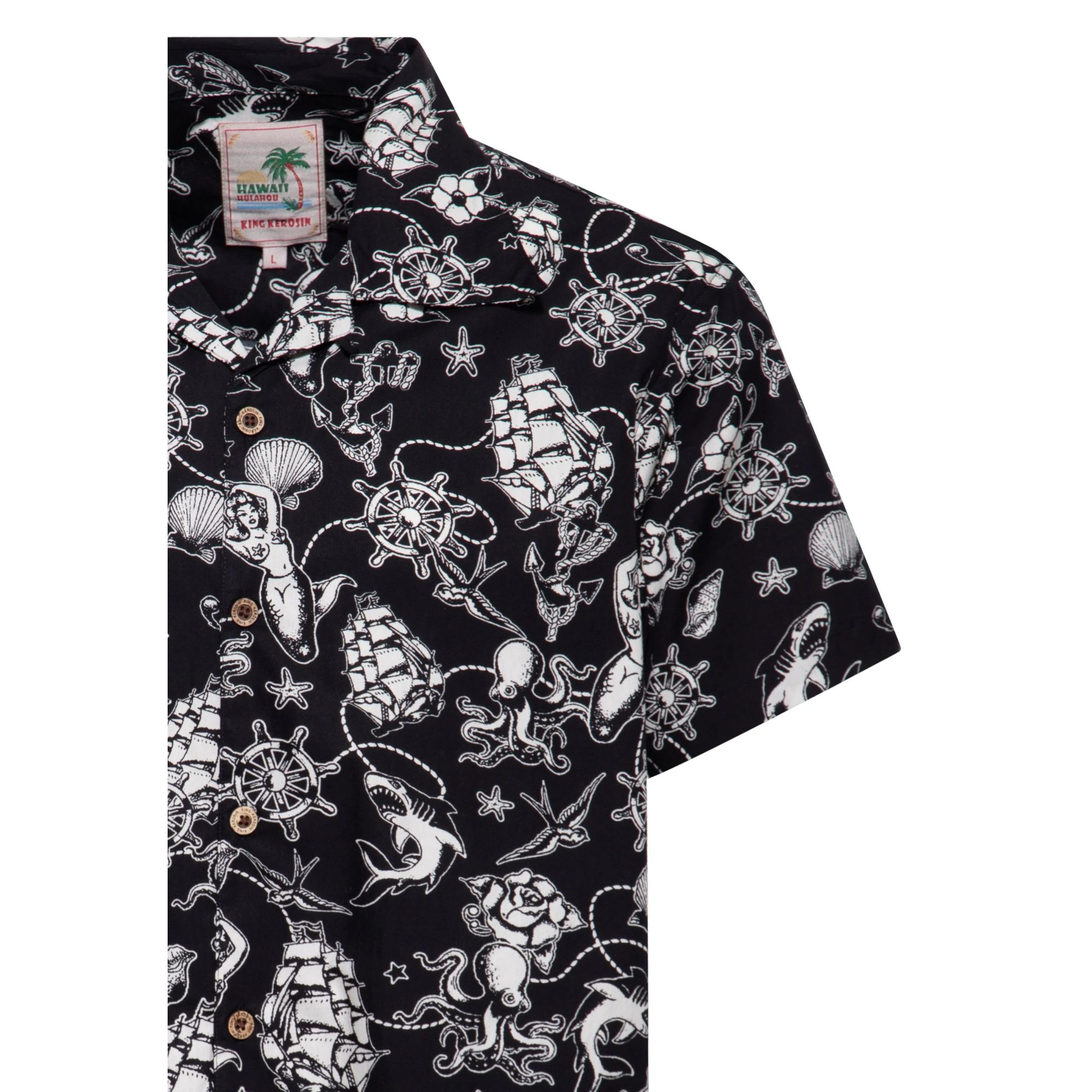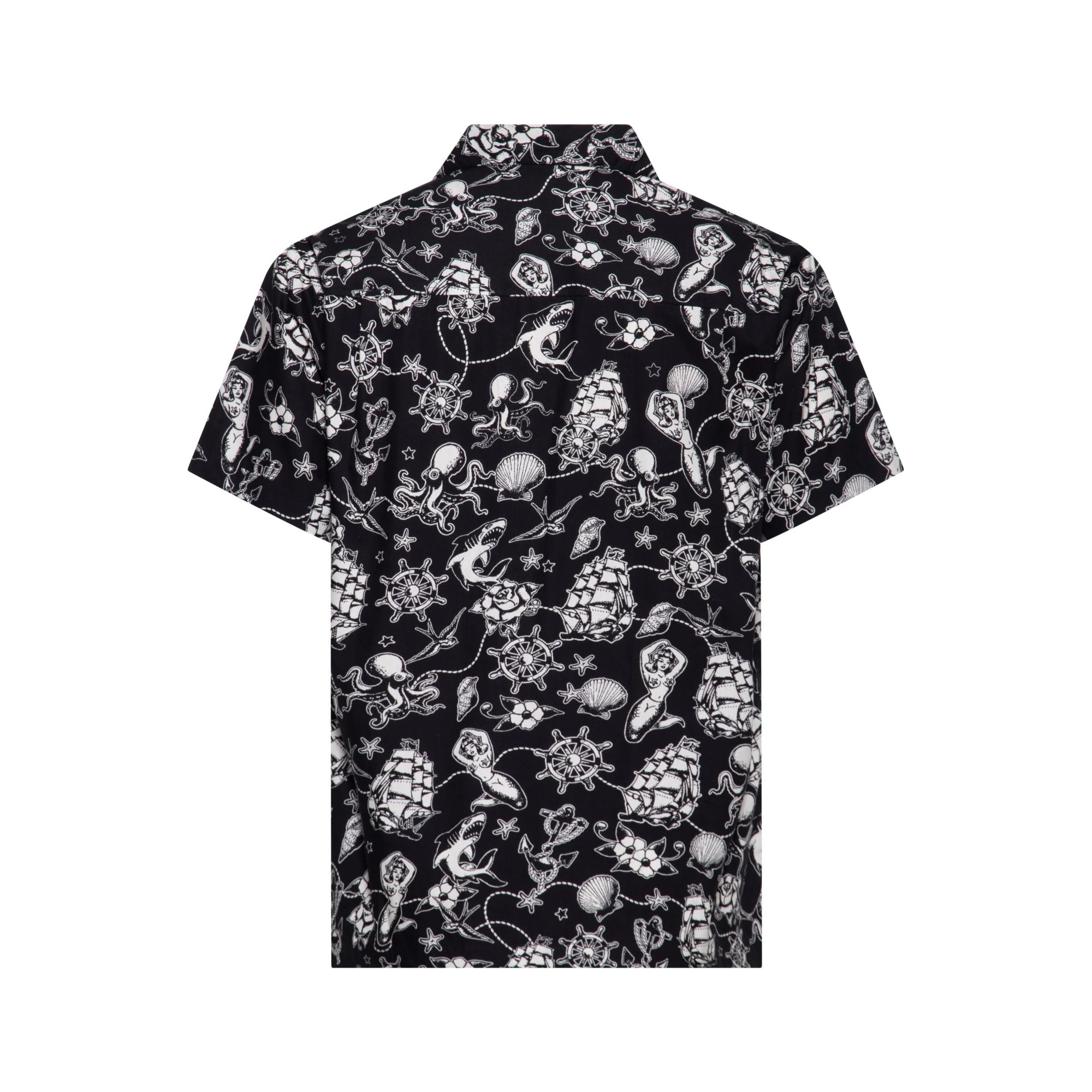 - Schwarzes Hawaii Hemd mit weißem Allover-Print im Oldschool-Sailor-Tattoo-Stil mit Segelschiffen, Steuerrädern, Haien und Meerjungfrauen