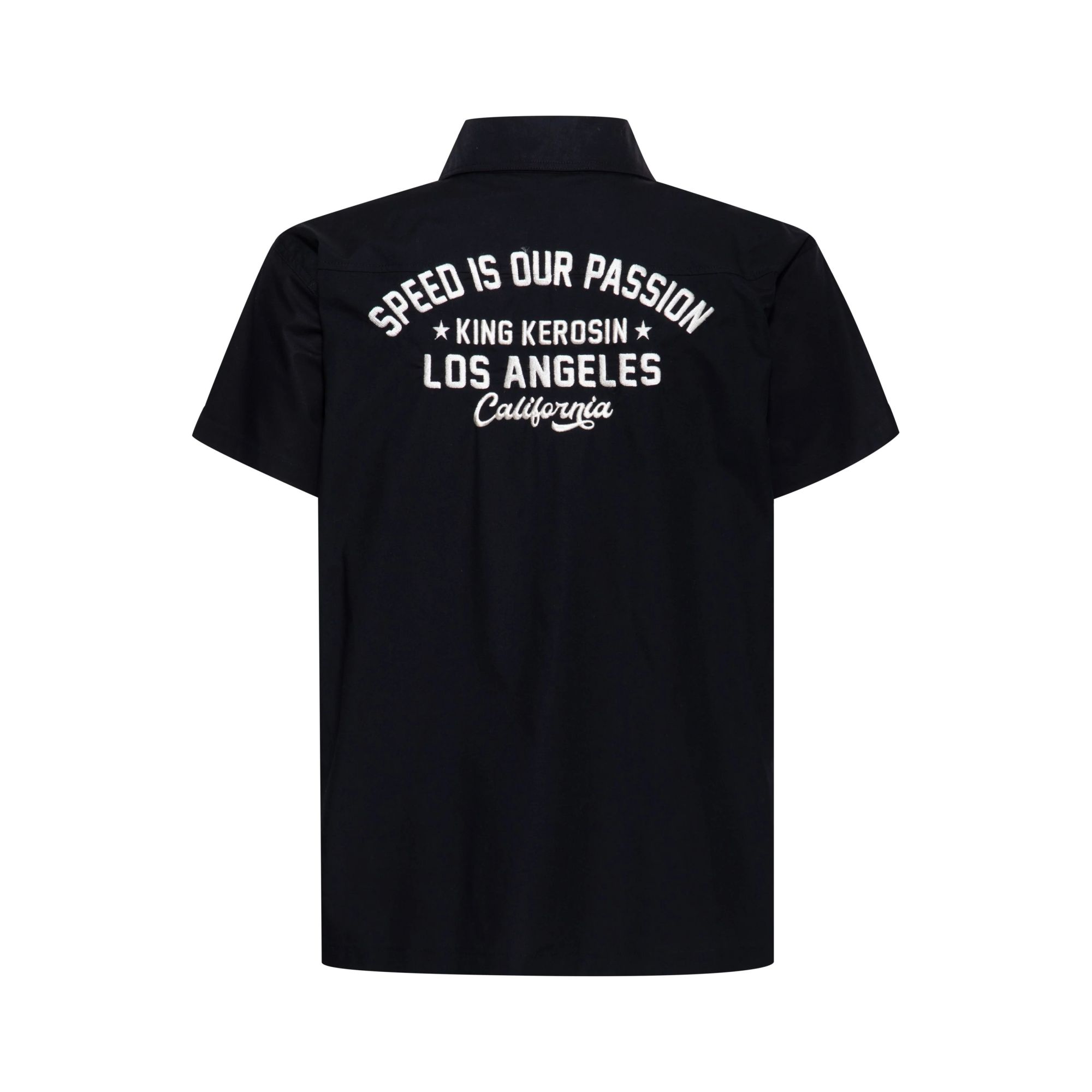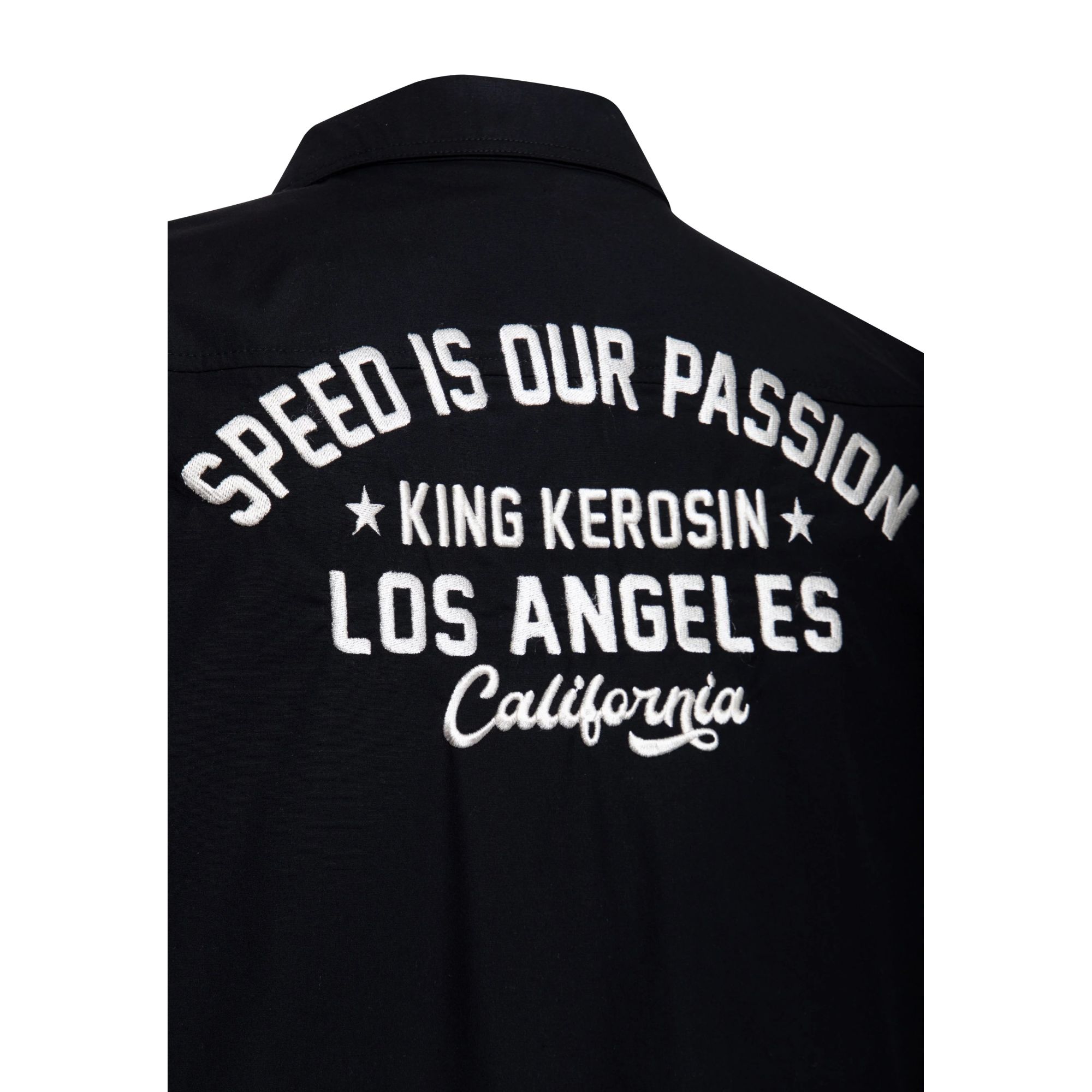 - Schwarzes Baumwoll-Hemd mit weißem "Speed is our Passion" Print auf der Rückseite, King Kerosin Racing Logo und Branding auf der Brust