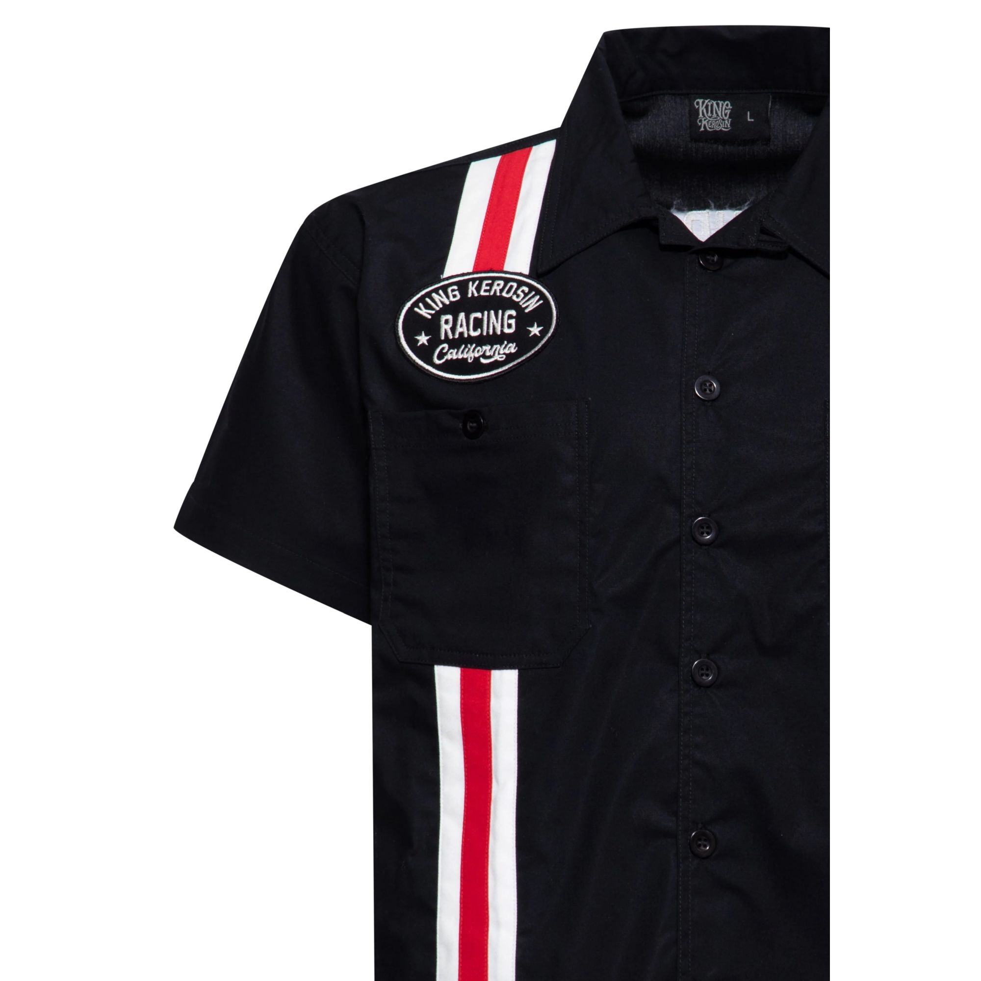 - Klassischer Reverskragen, aufgesetzte Brusttaschen, rote und weiße Striping-Details an den Seiten für authentischen Dragstrip-Look