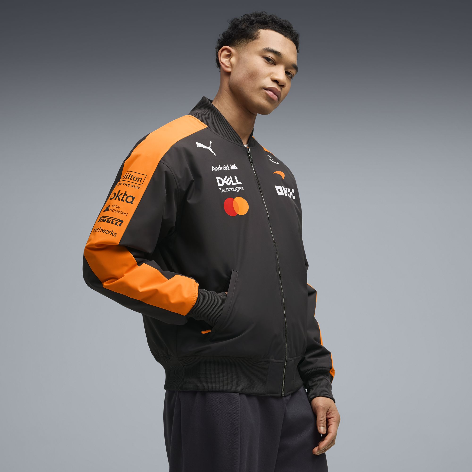 Die Vorderseite in Anthrazit trägt das McLaren Logo sowie die Logos der Teamsponsoren, die der Jacke ihren authentischen Boxencrew-Look verleihen. Auf der Rückseite präsentiert sich der großflächige Schriftzug "McLaren Mastercard Formula 1 Team" zusammen mit dem McLaren Logo und dem Mastercard-Emblem. Die orangefarbenen Einsätze an Schultern und Ärmeln setzen markante Akzente, während die schwarzen Sponsoren-Prints auf den Ärmeln den dynamischen Racing-Look unterstreichen. Der durchgehende Reißverschluss ermöglicht ein bequemes An- und Ausziehen, zwei seitliche Reißverschlusstaschen bieten praktischen Stauraum. Der Stehkragen und die elastischen Bündchen an Ärmeln, Kragen und Saum sorgen für optimale Passform und angenehmen Tragekomfort. Das Puma Branding rundet das authentische Design stilsicher ab.