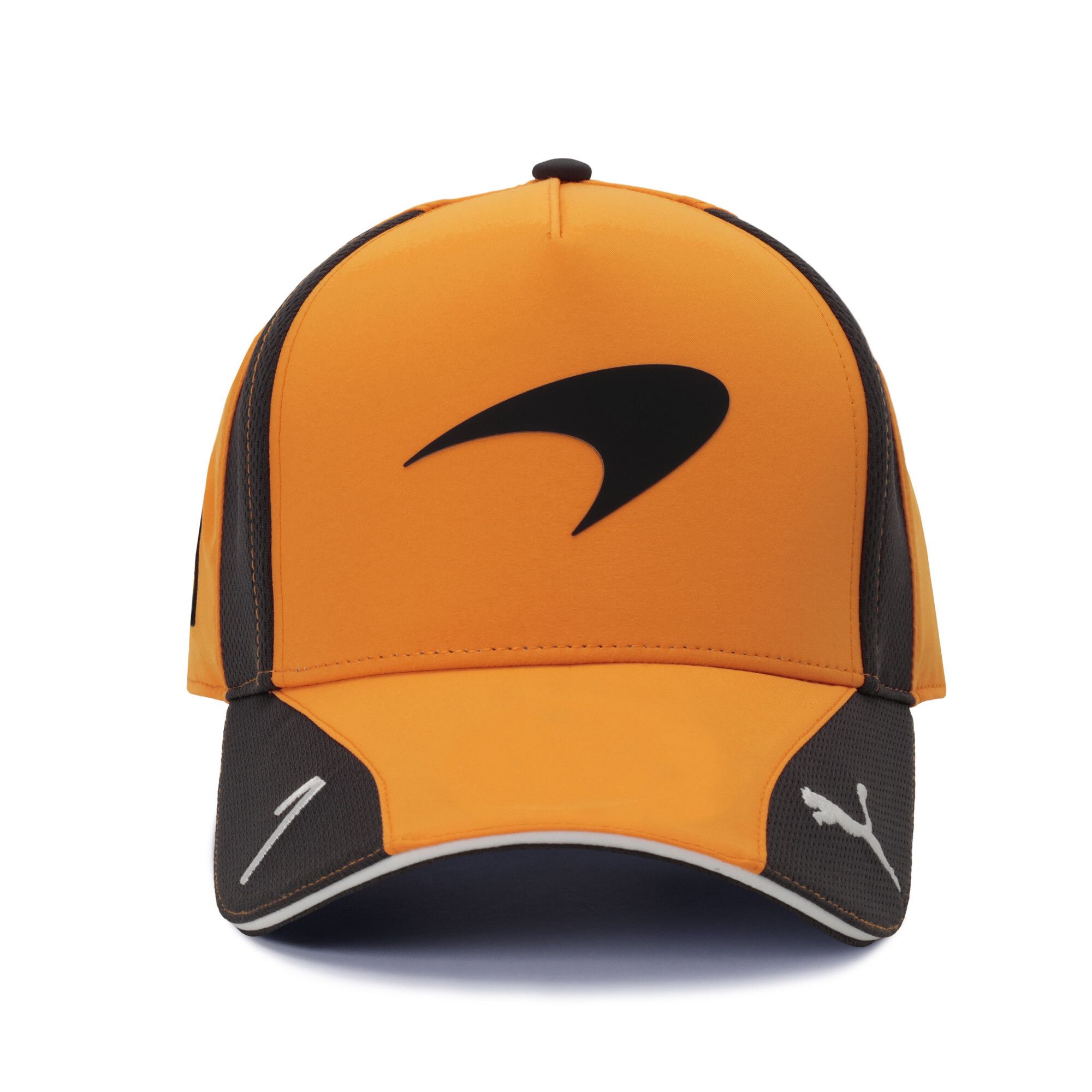- Orangefarbene Cap mit charakteristischem McLaren Swoosh auf der Vorderseite, Fahrzeugnummer "1" auf der Visierkante