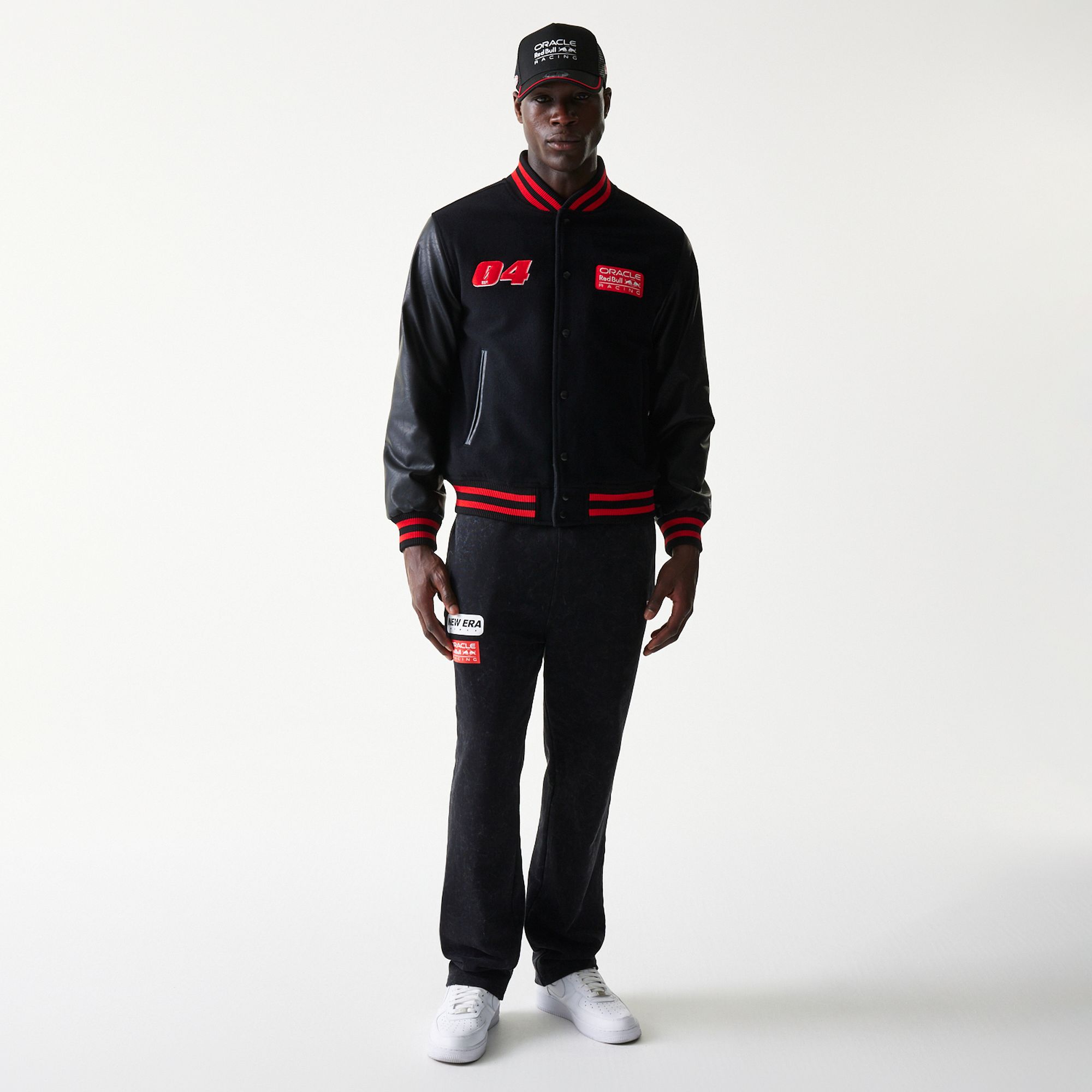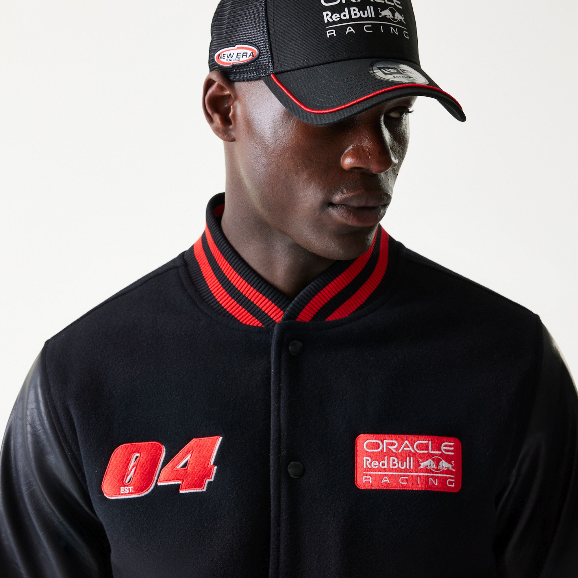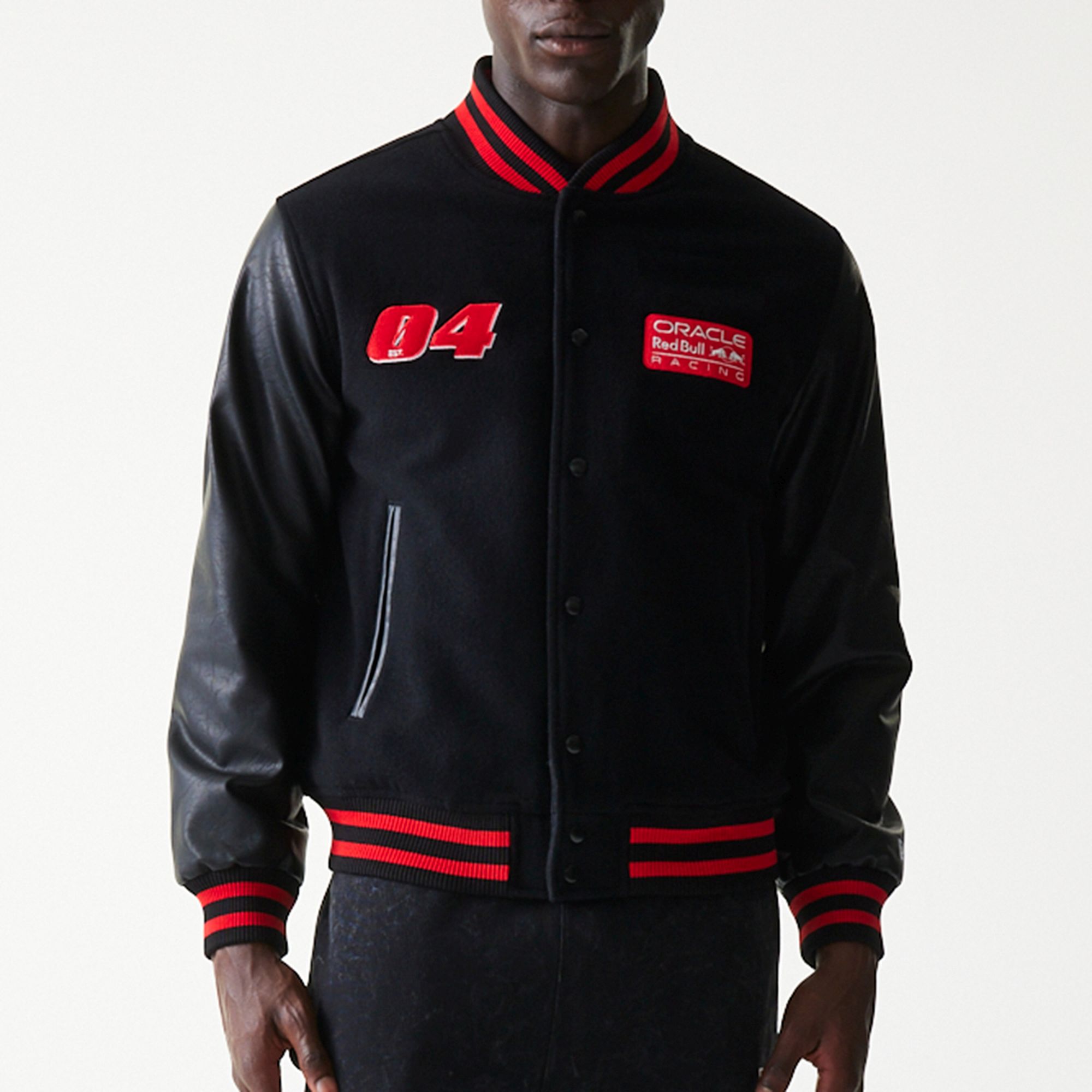 Die Red Bull Racing Collegejacke von New Era verbindet klassischen Varsity-Style mit moderner Motorsport-DNA. Das schwarze Design wird durch markante rote Akzente an Kragen, Bündchen und Saum ergänzt und sorgt für einen sportlichen, hochwertigen Look. Auf der Brust setzen die gestickte Startnummer 04 sowie das Oracle Red Bull Racing Logo klare Racing-Statements.