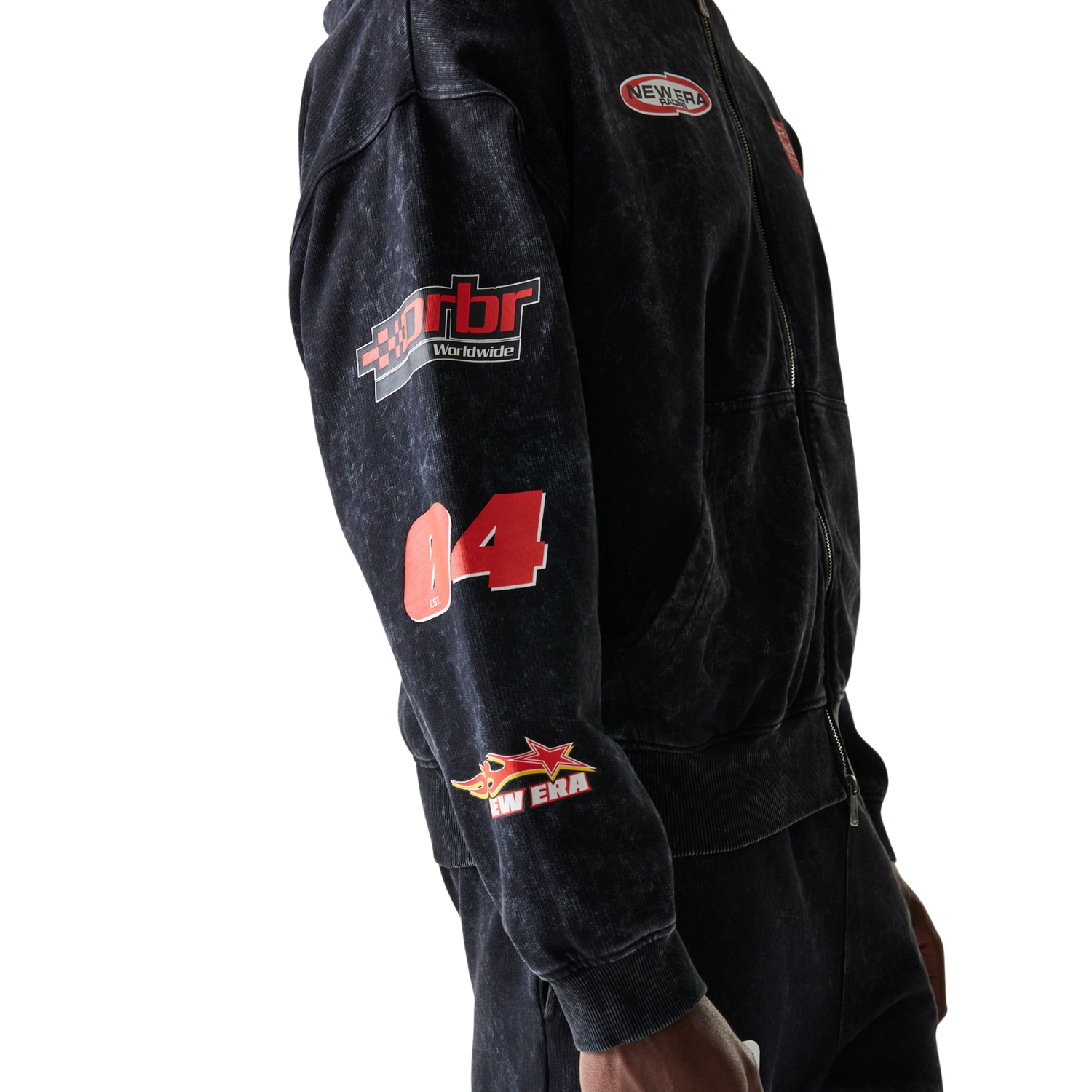Besonderes Highlight ist die detailreiche Gestaltung der Ärmel: Hier finden sich mehrere Motorsport-Grafiken wie das ORBR Worldwide Logo, die Startnummer 04, weitere Racing-Patches und das New Era Flaglabel. Auf der Rückseite runden groß platzierte ORBR-, New Era Racing- und New Era Racing Team Prints den Look eindrucksvoll ab. Eine Sweatjacke für Fans, die Racing nicht nur feiern, sondern leben.