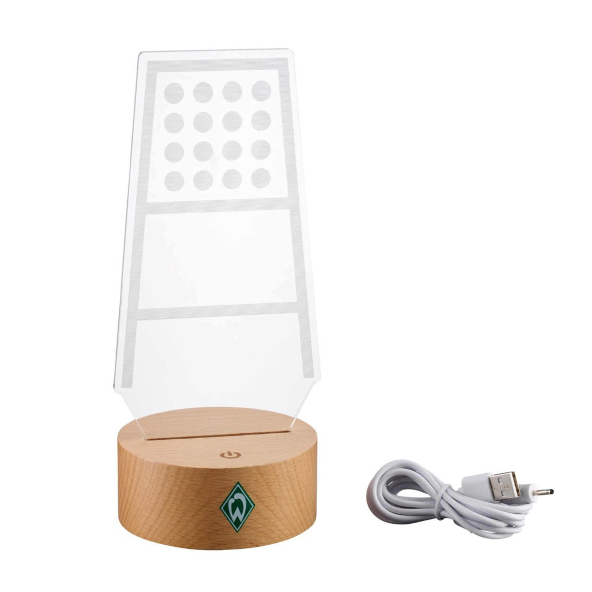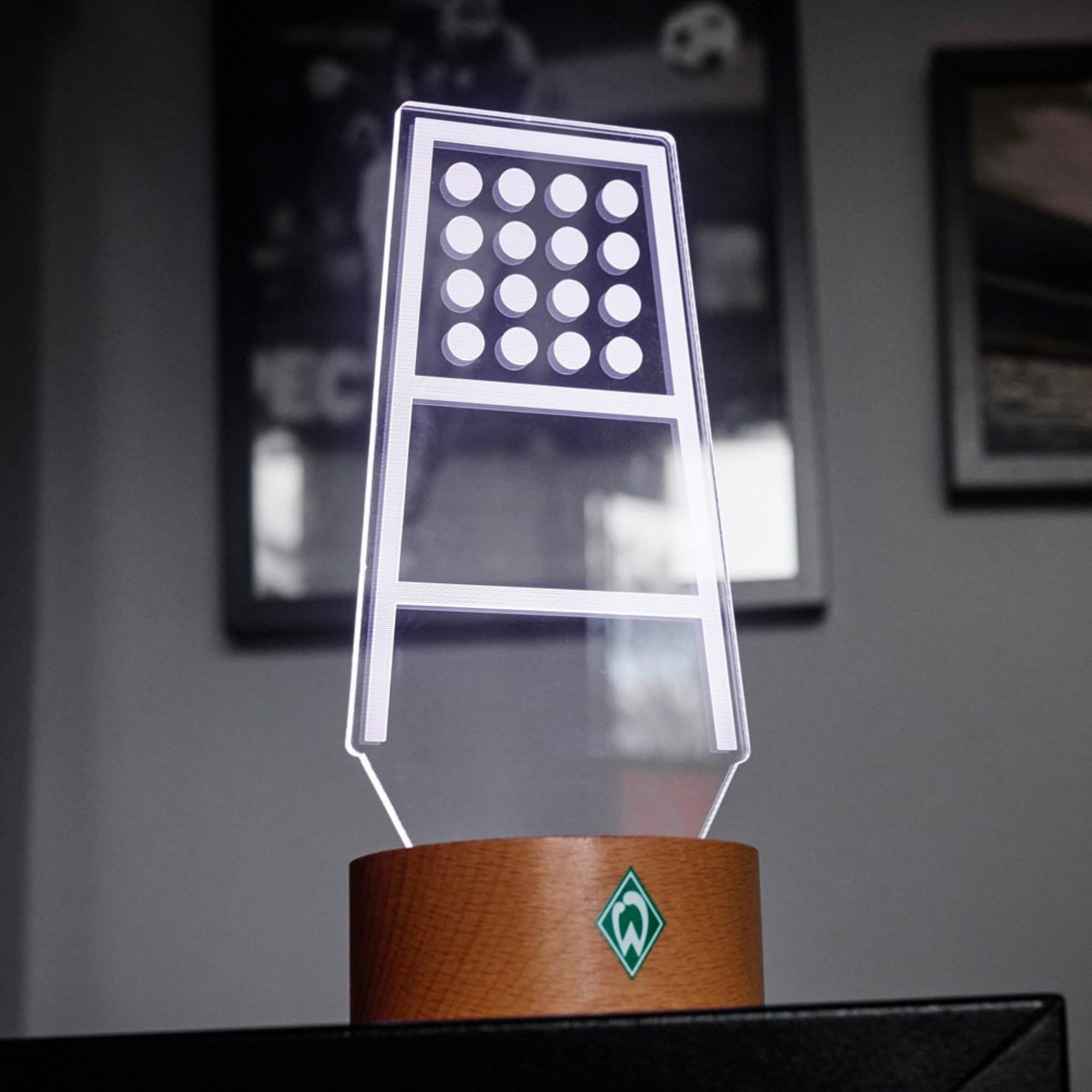 Das Werder Bremen LED Licht kommt in Form der ikonischen Flutlichtmasten aus dem Weserstadion. Das Licht kann in grün, aber auch in weiß erstrahlen. Der Flutlichtmast steht auf einem Holzsockel, welcher zusätzlich die Werder-Raute auf der Vorderseite trägt.