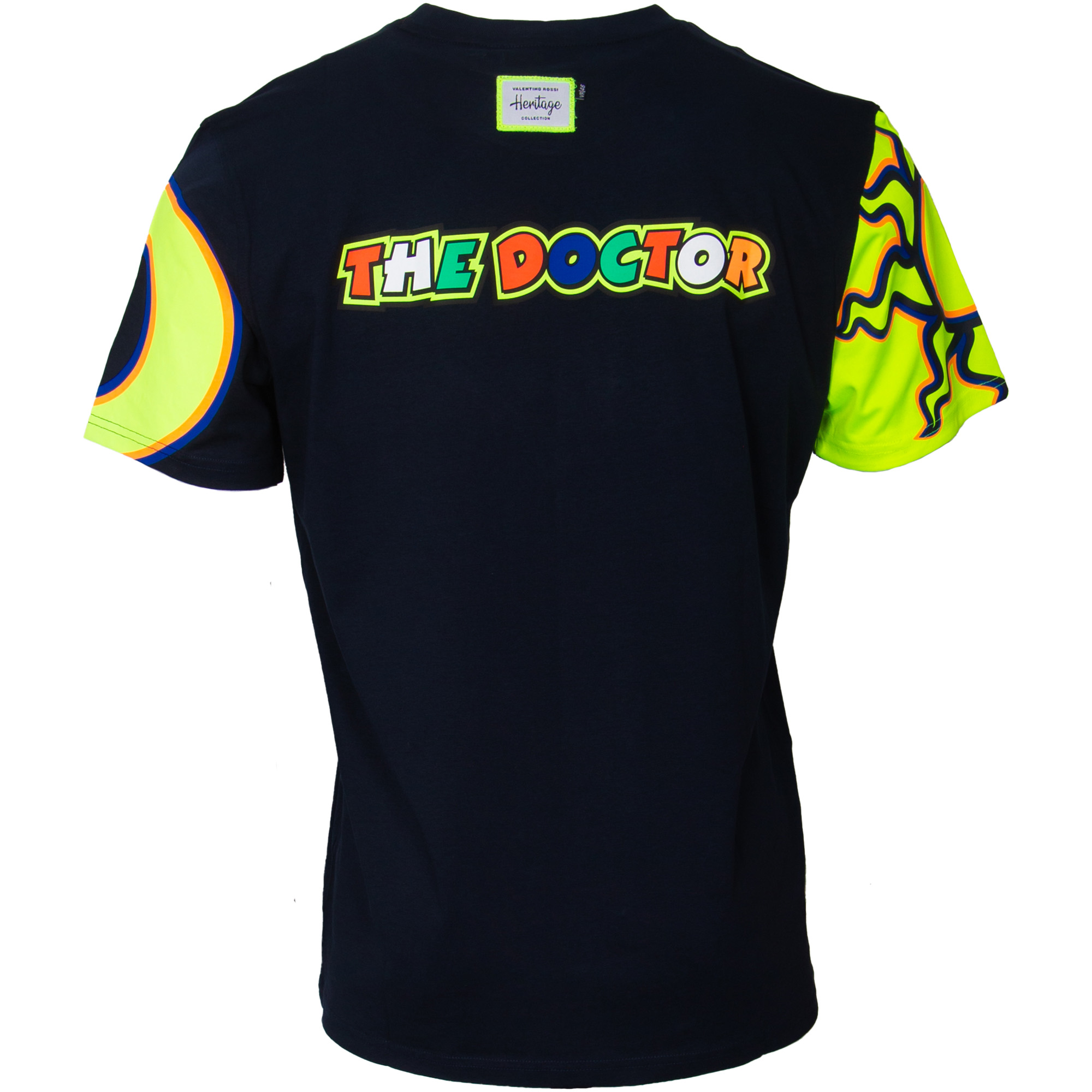 Das dunkelblaue T-Shirt begeistert mit einem großformatigen „46“-Print in Neongelb mit blau-orangenem Outline auf der Brust – umrahmt von auffälligen neongelben Ärmeln, die auf der linken Seite das Sonnen- und auf der rechten Seite das Mond-Motiv in typischer Rossi-Grafik zeigen. Auf der Rückseite sorgt der mehrfarbige „The Doctor“-Schriftzug in Rot, Grün, Blau, Orange und Weiß für den perfekten Abschluss dieses Heritage-Designs. Ein Heritage Collection Label am Kragen rundet das authentische Gesamtbild ab.